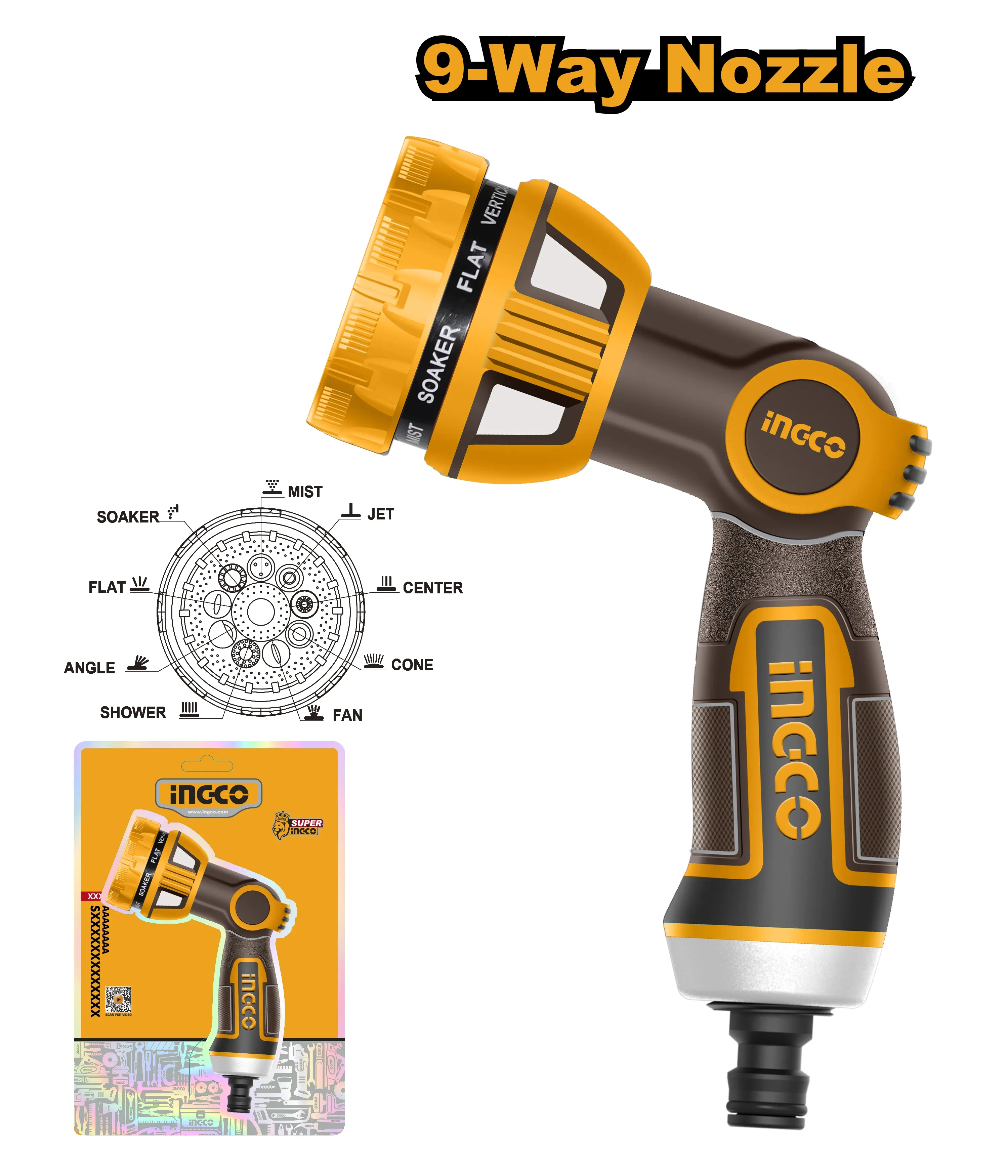 Pistole disponuje devíti postřikovacími vzory včetně sprchy, úhlového postřiku, středového paprsku, vějířovitého postřiku, kuželu, proudu, mlhy, prosakování a plochého proudu. Vypínací mechanismus umožňuje jednoduché ovládání jednou rukou. Pohodlná gumová rukojeť zajišťuje ergonomické držení a bezpečný úchop. Kompatibilní se standardním adaptérem 3/4". Ideální pro zavlažování zahrad, čistění fasád a údržbu venkovních prostor.