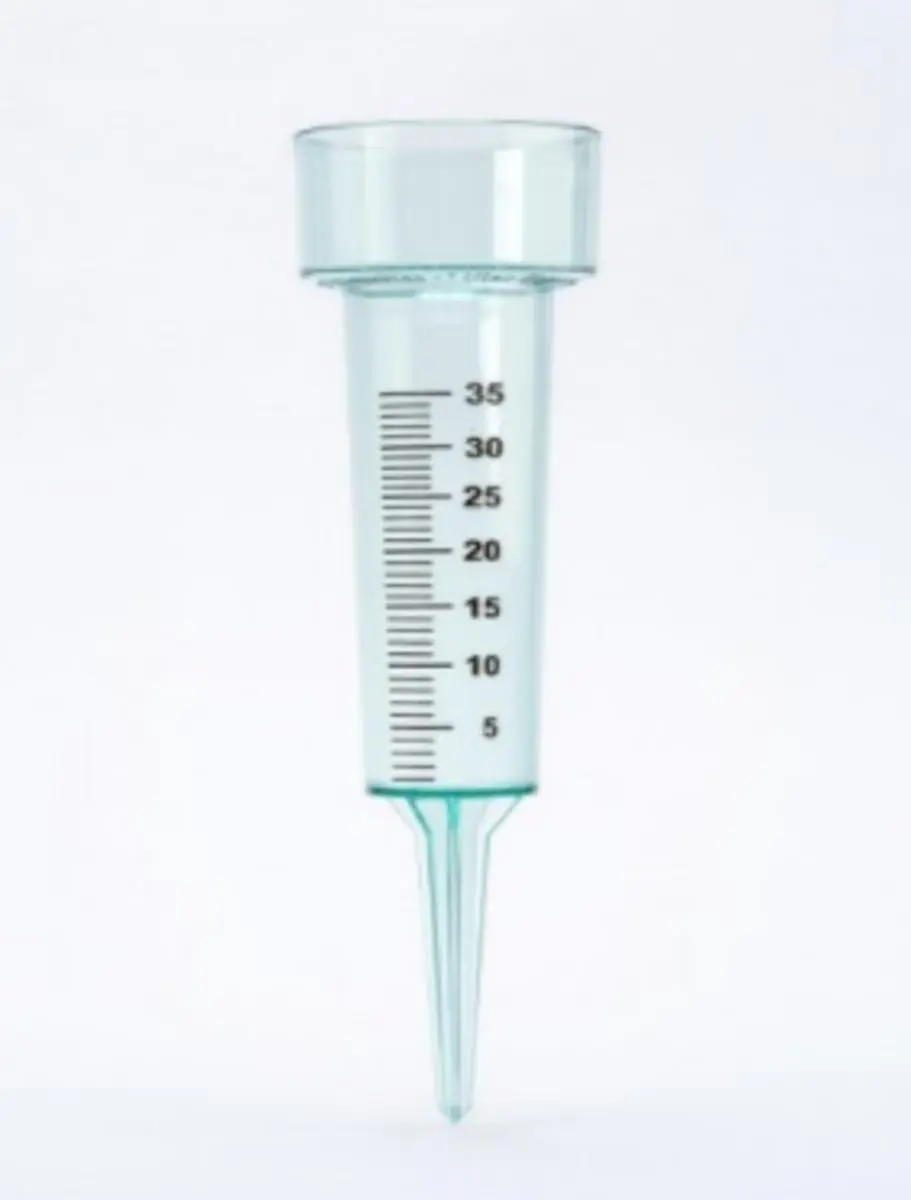 Určeno k měření množství srážek. K upevnění (zapíchnutí) do země slouží čtvercový hrot, výška 27 cm, průhledná barva.