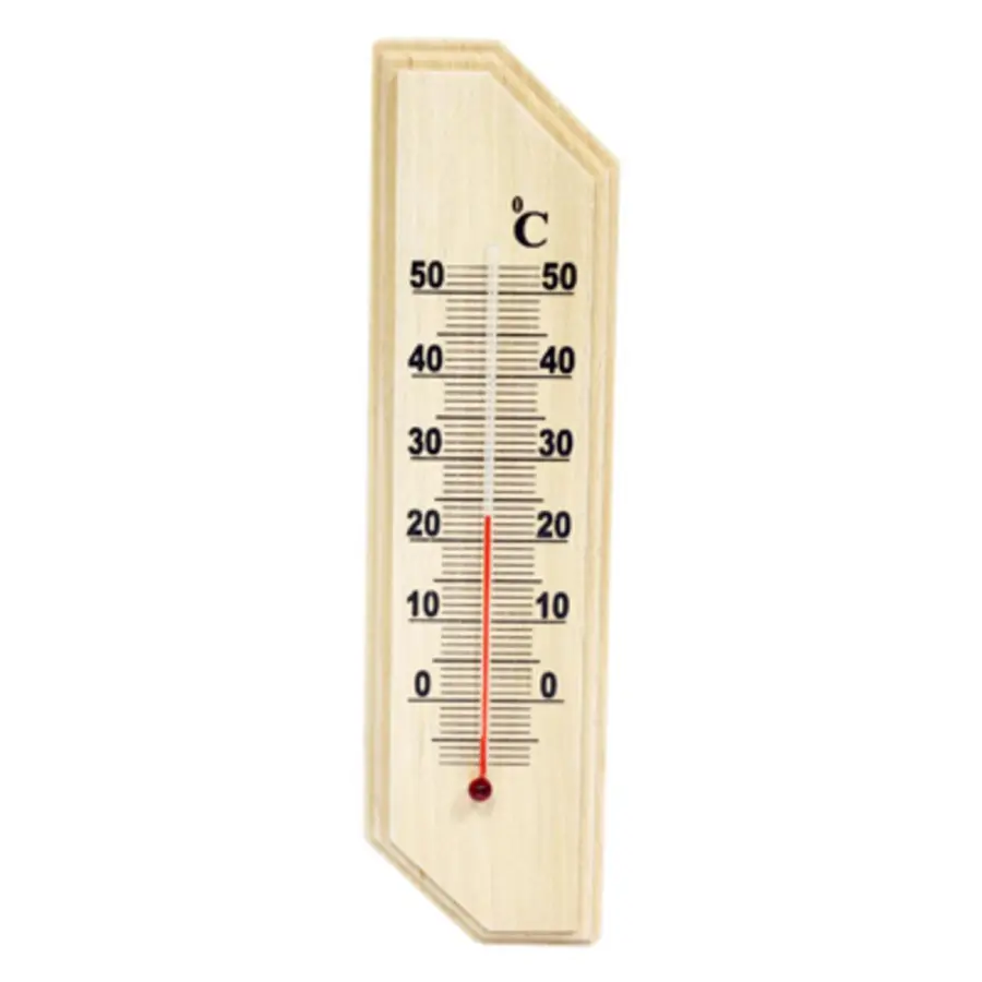Dřevěný pokojový teploměr o délce 22 cm. Stupnice teploměru od - 10 °C do +50 °C. Světlé nebo tmavé dřevo. Teploměr neobsahuje rtuť.