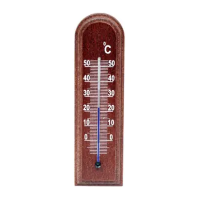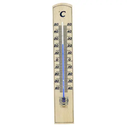 Dřevěný pokojový teploměr o délce 22 cm. Stupnice teploměru od - 10 °C do +50 °C. Světlé nebo tmavé dřevo. Teploměr neobsahuje rtuť.