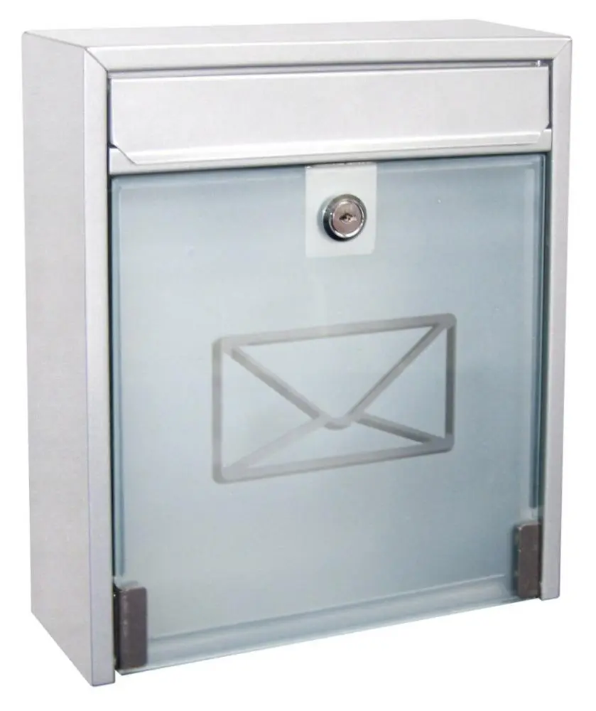 kovová, rozměr 30x26 cm, šířka 9 cm, přední dvířka tvrzené sklo, z pozinkovaného plechu lakovaného práškovou vypalovací barvou je určena do interiéru i exteriéru, včetně okénka na jmenovku a zámku s klíčem 2x