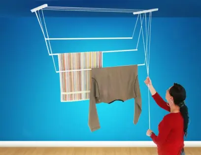 Stropní sušák s kovovou rukojetí pro praktické sušení prádla. Šířka 1,9 m, 5 šňůr na sušení prádla. Snadný výsuvný systém pod strop. Ideální do koupelny, na balkon apod.