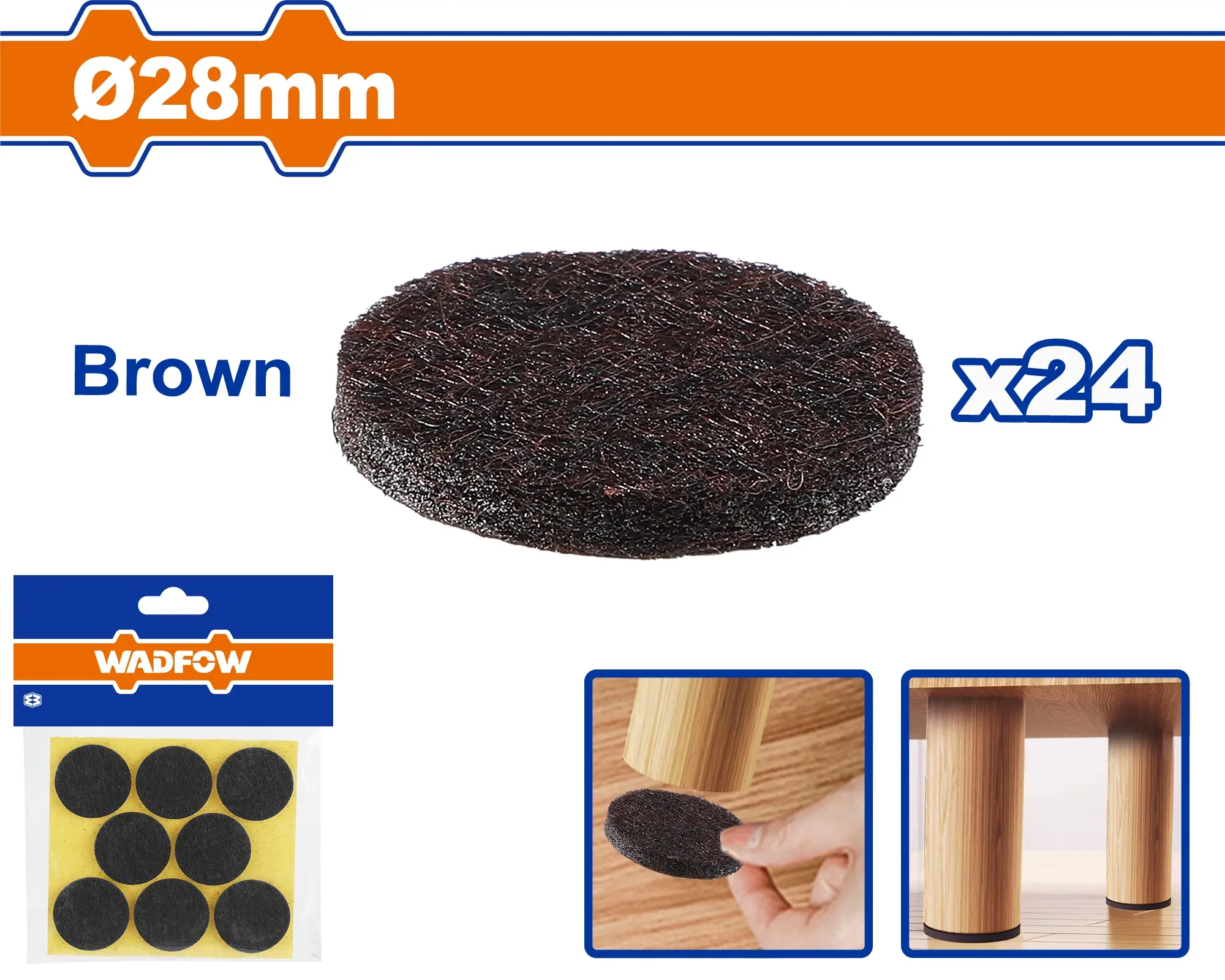 Větší samolepící podložky o průměru 28 mm v hnědé barvě slouží k ochraně podlah a jsou méně nápadné na tmavém povrchu. Vhodné pro těžší nábytek a velké nožičky. Sada obsahuje 24 kusů.