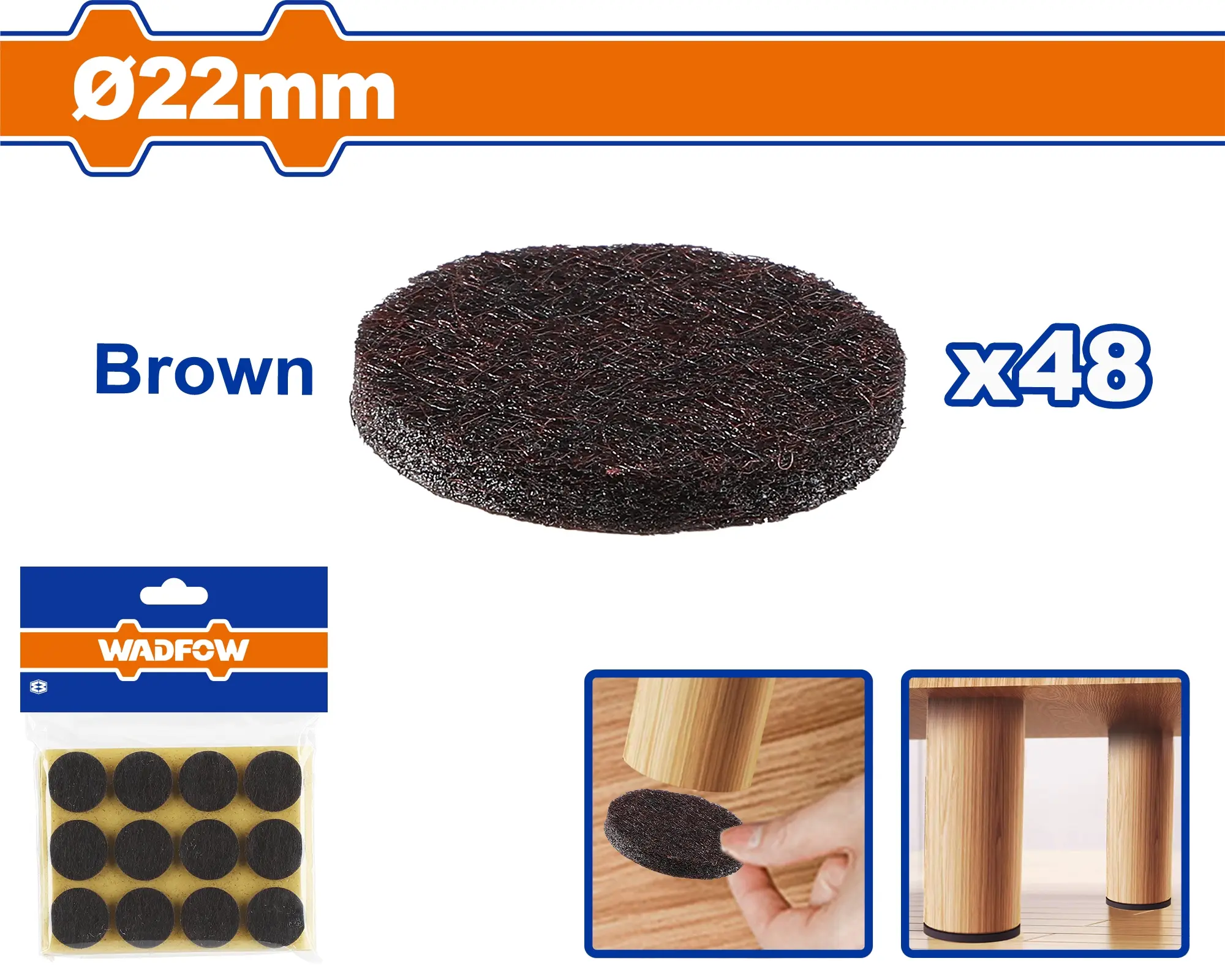 Středně velké samolepící podložky o průměru 22 mm v hnědé barvě jsou vhodné pro běžný nábytek. Sada obsahuje 48 kusů.