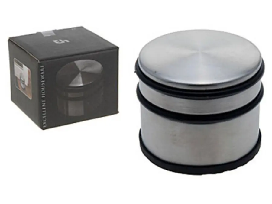 nerezová zarážka dveří, má kulatý tvar, průměr 9cm, výška 7,5cm, ze spodní strany má gumovou protiskluzovou část