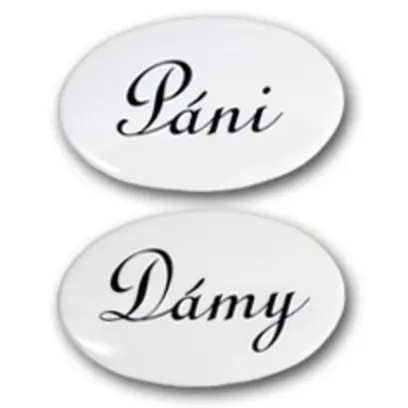 Plastové 2-dílné označení na dveře s nápisem dámy na jednom kuse a pánové na druhém kusu. Má oválný tvar. Rozměry má 6,5 x 10,5 cm. Připevňuje se pomocí samolepící lepky ze zadní části