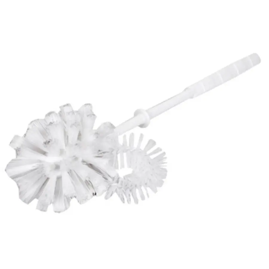 Plastová WC štětka s dalším malým kartáčkem na vnitřním rámu. Průměr kartáče je 7,5 cm a délka kartáče spolu s rukojetí je 35 cm