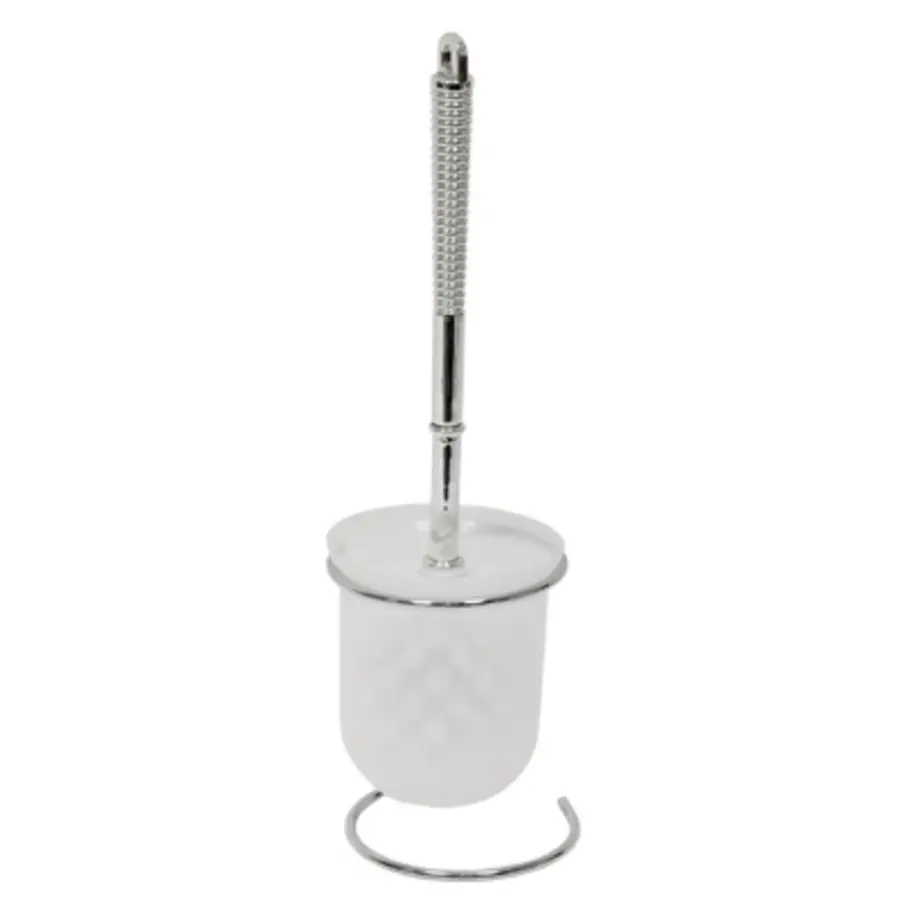 plastová, imitace chromu, plastová nádobka na kartáč v kovovém stojanu, výška spolu se stojanem 35 cm, průměr kartáče 8 cm, průměr nadoby 10 cm