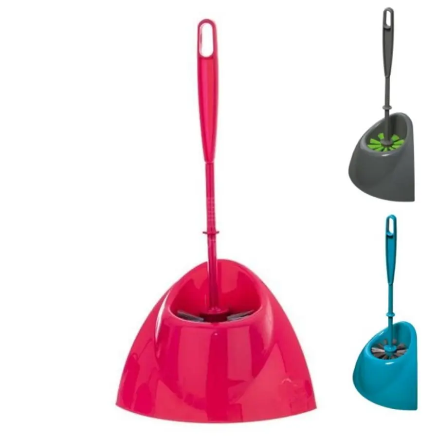 Plastový kartáček vložený do rohové plastové nádoby. Tvar trojúhelníku. Nádoba má rozměry 20 x 14 cm. Průměr kartáče je 7 cm. Délka kartáče s rukojetí je 35 cm. Rukojeť je v horní části mírně tvarovaná. Výška celé sady je 37 cm. Má různé barvy