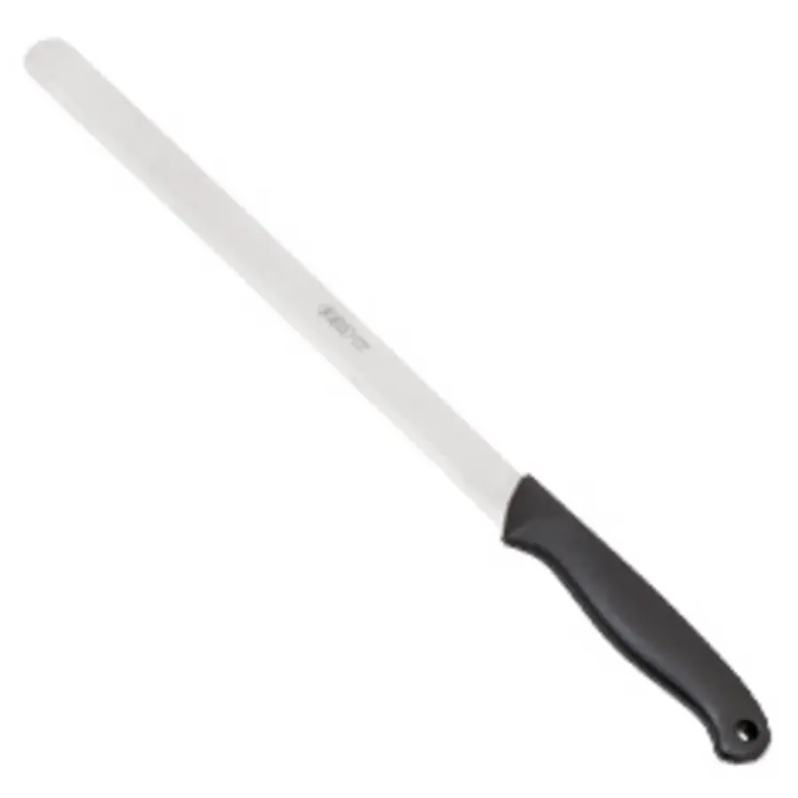 nerezový, hladký, plastová rukojeť černé barvy s očkem na zavěšení, délka čepele 22 cm, celková délka 34cm, ,