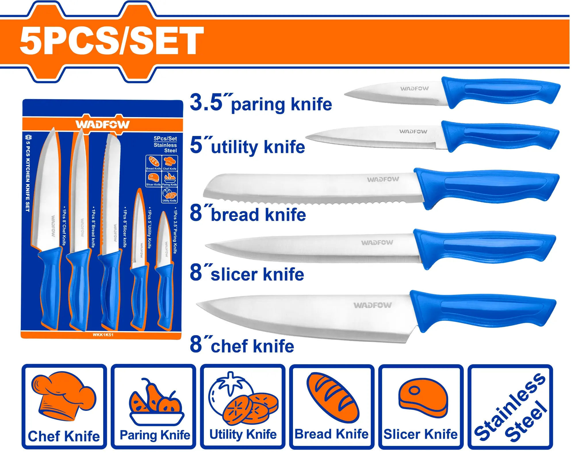 Set zahrnuje robustní nůž šéfkuchaře a porcovací nůž pro práci s masem, nůž na chleba se speciálním vlnitým ostřím, střední univerzální nůž pro běžné krájení a malý loupací nůž pro precizní práci se zeleninou. Rukojeti z polypropylenu (PP) jsou lehké, hygienické a snadno omyvatelné. Celá sada je balena v blistru, který chrání čepele a umožňuje okamžitý přehled o obsahu.