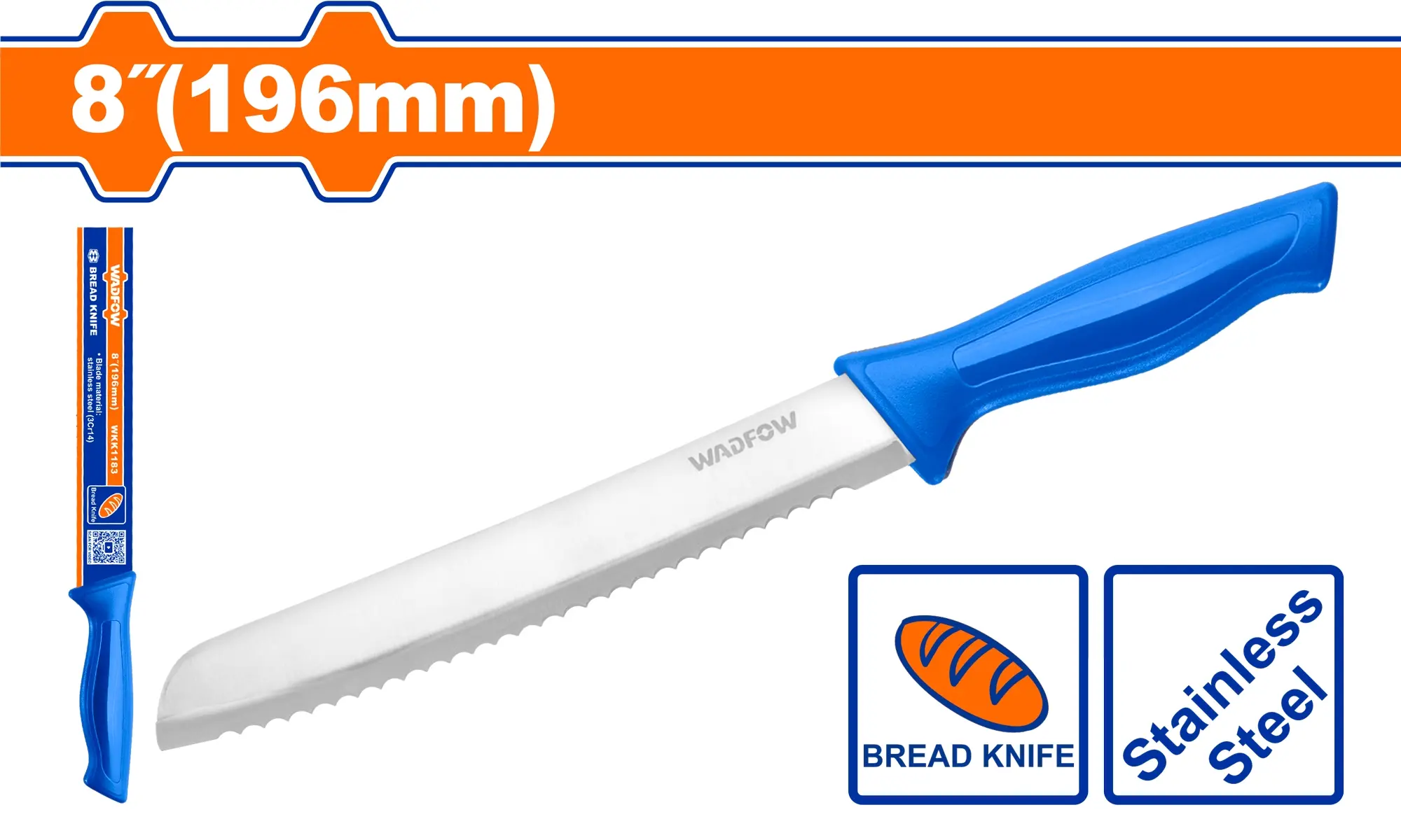 Délka nástroje 196 mm poskytuje dostatečný rozsah pro plynulé krájení i širších bochníků jedním tahem. Rukojeť je vyrobena z polypropylenu (PP), což je lehký a hygienický materiál, který se velmi snadno čistí a je odolný vůči vlhkosti. Balení na papírové kartě zajišťuje ochranu čepele a umožňuje snadnou prezentaci výrobku.