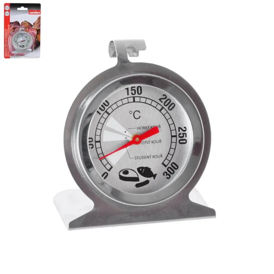 Teploměr do trouby nebo udírny uhlídá správnou teplotu během přípravy masa. Můžete zavěsit nebo vložit do měřeného prostoru. Měří teplotu od 0 do 300 °C, stupnice po 10 °C. Materiál: nerez, sklo. Rozměry: 6x4x7 cm.