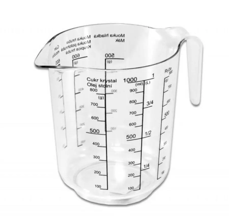 Plastová odměrka o objemu 1 l, kalibrovaná, čirá, s rukojetí, vhodná k odměřování mouky, rýže, cukru, máku, oleje, vody atd. Rozměry: 14x11,5 cm.