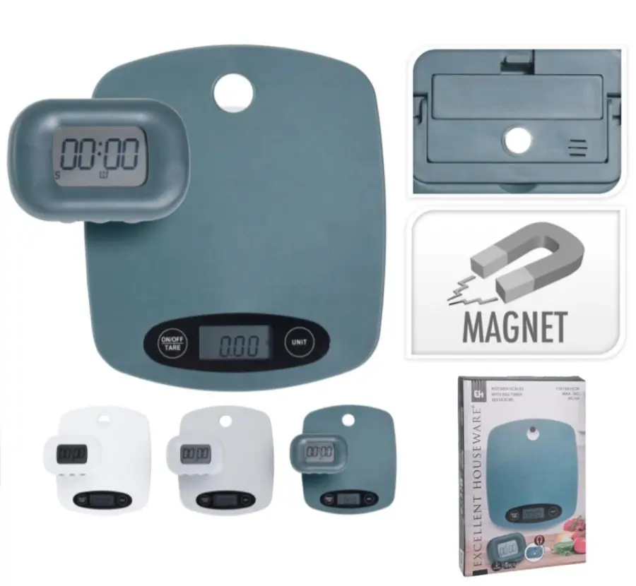 sada digitální kuchyňské váhy a minutky, hmotnost do 5kg, rozměry 170x195x150mm, 3 funkce: gramy, OZ, LB, velikost minutky 85x55x20mm s magnetem na zadní straně, obě fungují na baterie (nejsou součástí balení) 2x AAA a 1x AAA, mix 3 barev: bílá, šedá
