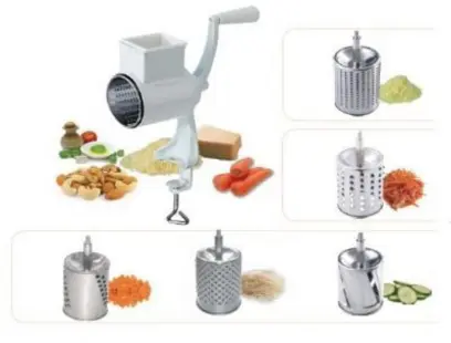 kovový, upínání na stůl pomocí upínacího šroubu, na strouhanku, ořechy, sýr, výška za stolem 20 cm, průměr bubnu 70 mm, možnost dokoupení dalších typů bubnů