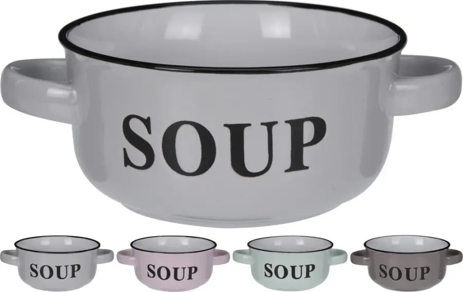 miska na polévku keramická, objem 490ml, se 2 držadly a nápisem "SOUP", rozměr 180x130x65mm, váha 425g, mix 4 pastelových barev - mentolovo-zelená, růžová, šedohnědá, šedá