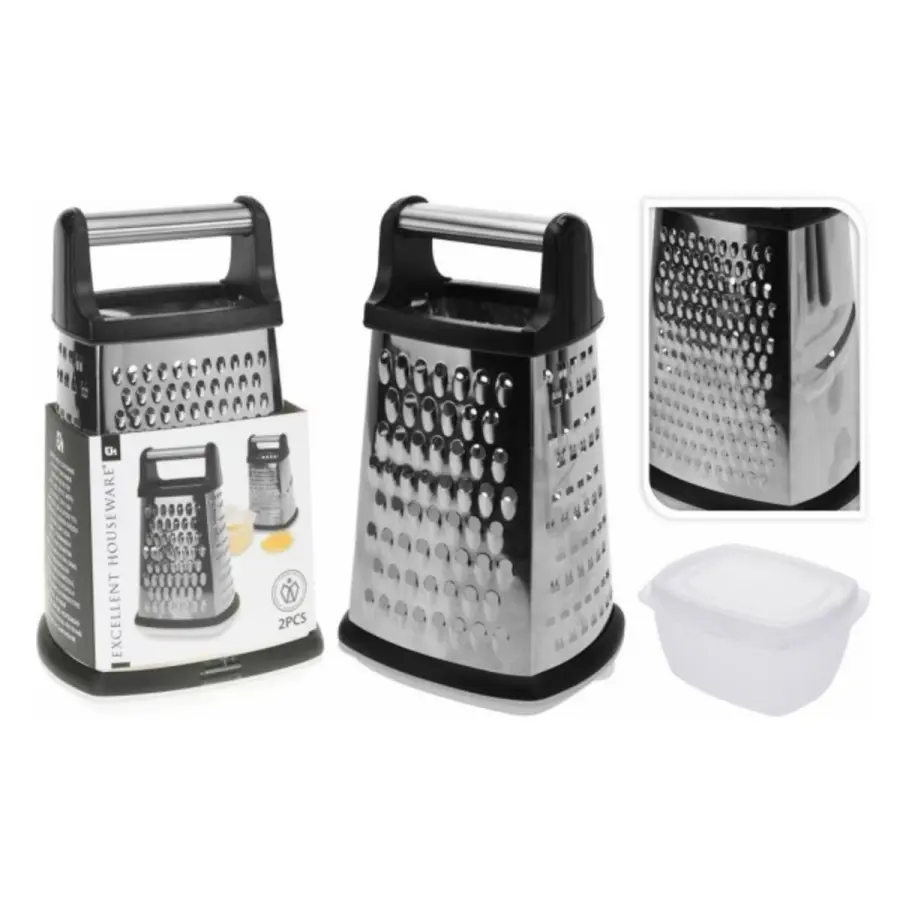 Struhadlo z nerezové oceli, 4 typy struhadel, se zásobníkem, velikost 24x14,5x11,5cm, čepele z nerezové oceli, ergonomická protiskluzová rukojeť černá, průhledný plastový zásobník, černé okraje z TPR.