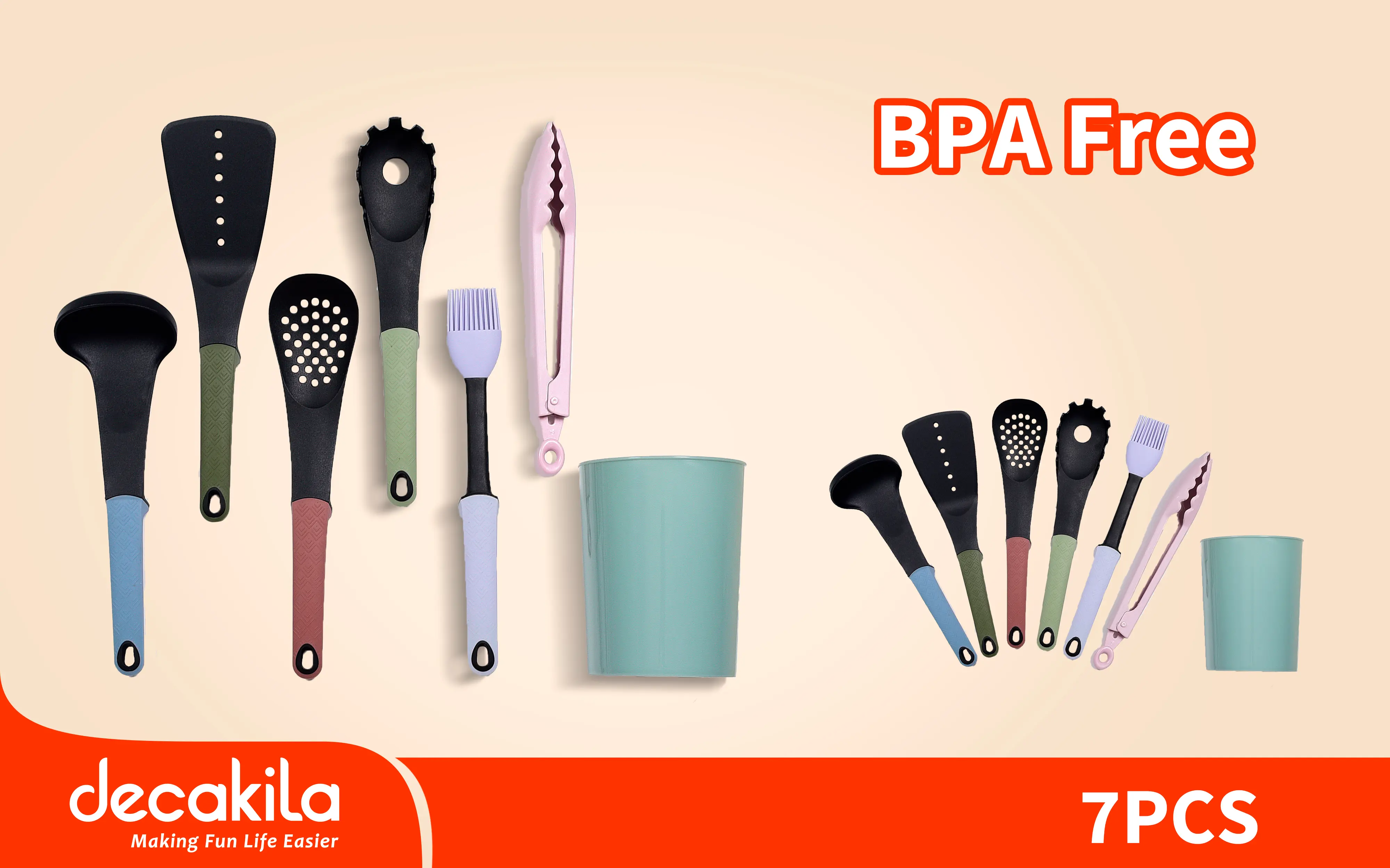 Oživte svou kuchyni touto veselou a praktickou 7dílnou sadou kuchyňského náčiní. Sada je navržena tak, aby pokryla všechny základní potřeby při vaření a zároveň působila jako stylový doplněk na kuchyňské lince. Obsahuje 6 kusů různorodého náčiní vyrobeného z kvalitního nylonu a praktický plastový stojan, díky kterému budete mít vše vždy po ruce a úhledně srovnané.
