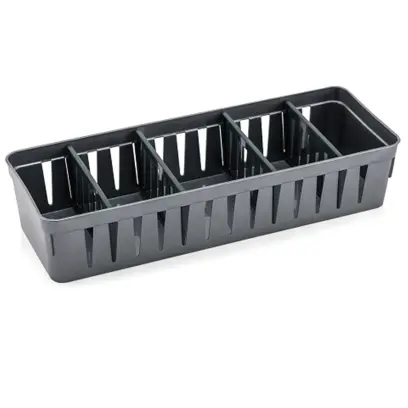 plastový univerzální organizér s vyjímatelnými přihrádkami, vytváří 5 úložných přihrádek (včetně 4 přepážek), velikost 112*315*65 mm, použitelný ve skříních nebo jinde v domácnosti pro uložení drobných předmětů.