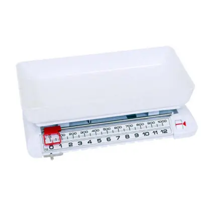kuchyňská, mechanická, stolní váha, s kilogramovým a gramovým posuvným závažím, max. do 13 kg, vybavená plastovou miskou ve tvaru obdélníku o rozměrech 30x15 cm.