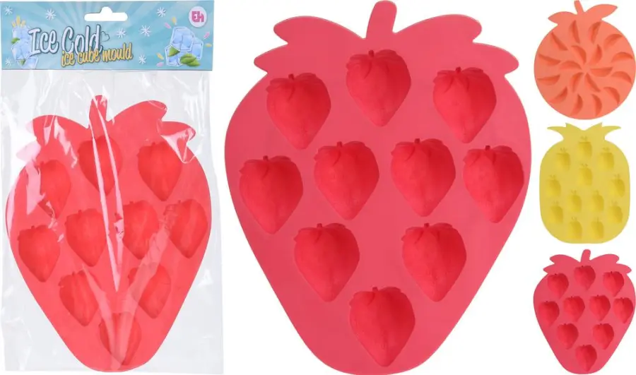 forma na ledové kostky, materiál TPR, hmotnost 50 g, forma ve tvaru ovoce - červená jahoda, žlutý ananas, pomeranč, velikost cca 190x160x20 mm.