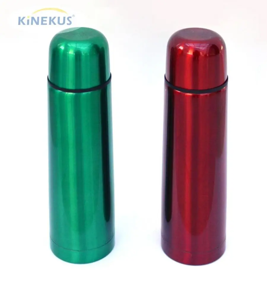 nerezová, objem 0,5 l, s jednodotykovým bezpečnostním uzávěrem, lehká a praktická, nevhodná do myčky nádobí, barevná metalická povrchová úprava, zelená nebo červená