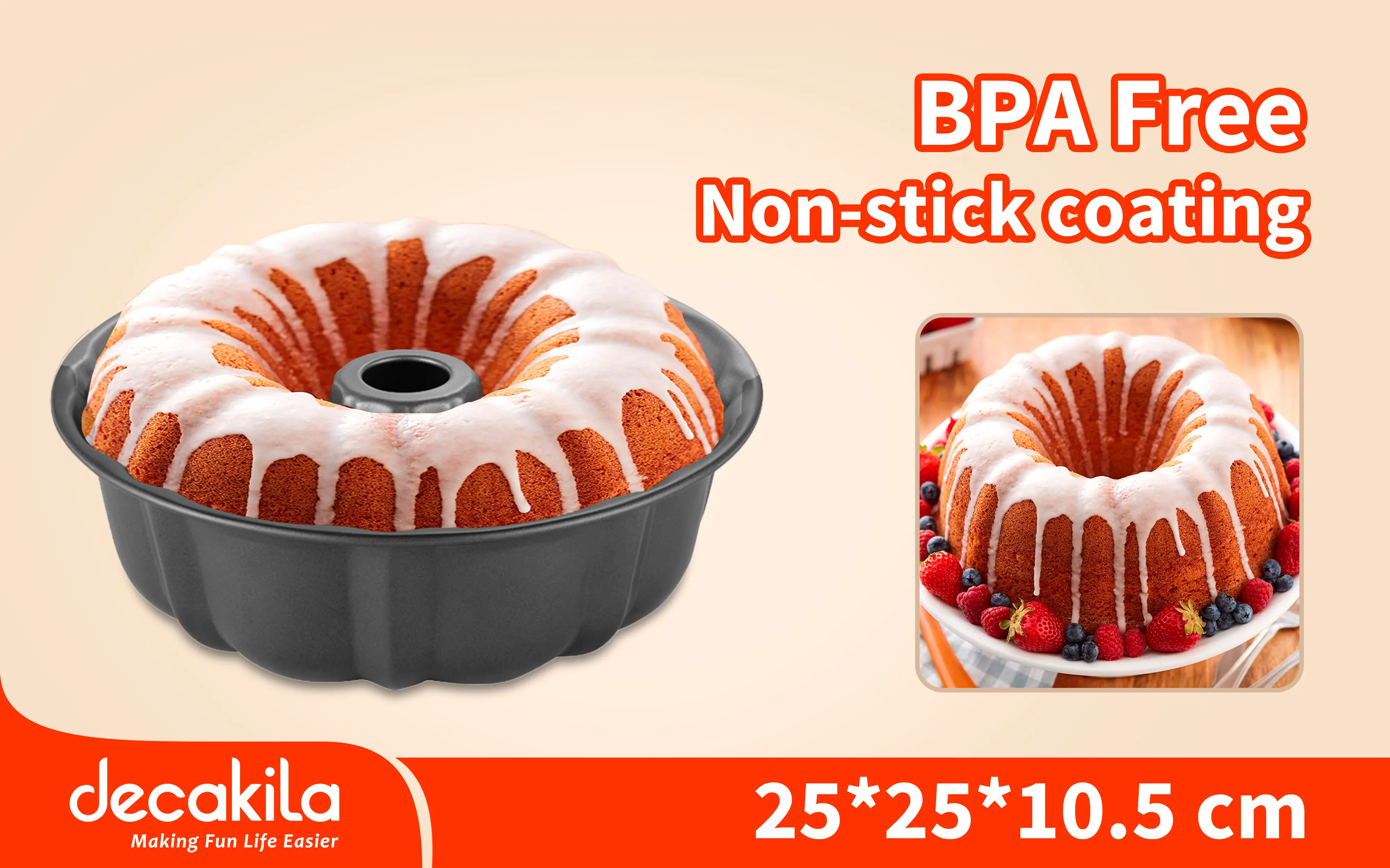 Forma na bábovku o rozměrech 25 × 10,5 cm je praktickým a odolným nástrojem vhodným pro přípravu tradičních bábovek, kroužkových koláčů a dalších pečených specialit. Díky kvalitní uhlíkové oceli s antiadhezivní úpravou vynikají vysokou pevností, dlouhou životností a snadným odstraněním upečeného těsta. Tloušťka materiálu 0,4 mm zajišťuje rovnoměrné rozvedení tepla během pečení a chrání koláč před přepalováním.