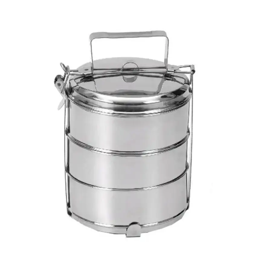 nerezový jídlonosič, 3-dílný, objem jedné nádoby je cca 0,75 l, průměr 16 cm, výška jednoho dílu 6,7 cm, celková výška 26 cm