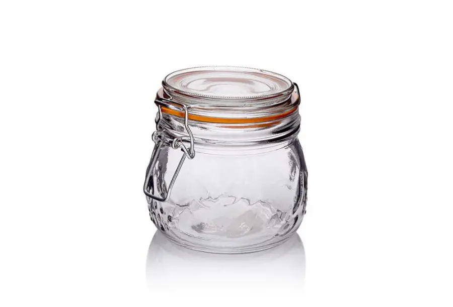 skleněná dóza se skleněným víčkem, součástí je kovový uzávěr s klipem a gumovým těsněním, objem 500 ml, kulatý tvar, průměr 10 cm, výška 11cm, hodí se na konzervování různých potravin i na zavařování, sklo je vzorováno