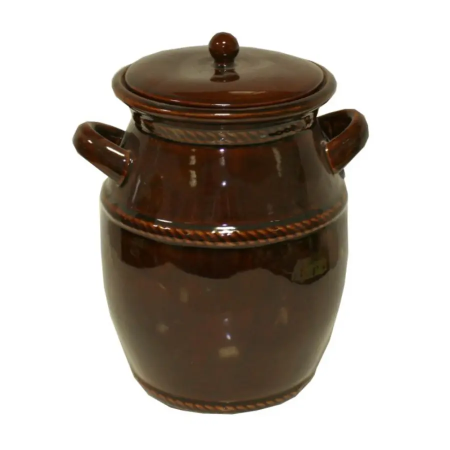 keramická, objem 4 l, horní průměr 16 cm, výška 24 cm, uši po stranách pro uchycení, hnědá, zdobená, vhodná na zelí, čalamádu