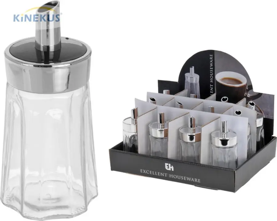 skleněná dávkovací cukřenka, dávkovač a horní okraj cukřenky je z plastu s imitací chromu, výška cukřenky 11 cm, průměr 6,5 cm, je tvarovaná.
