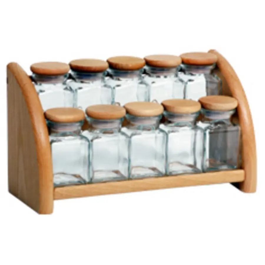 dřevěná polooblouková, závěsná, dvouřadá, 10 skleněných nádob s dřevěným víkem o rozměrech 5x150 ml a 5x120 ml, 33x18cm