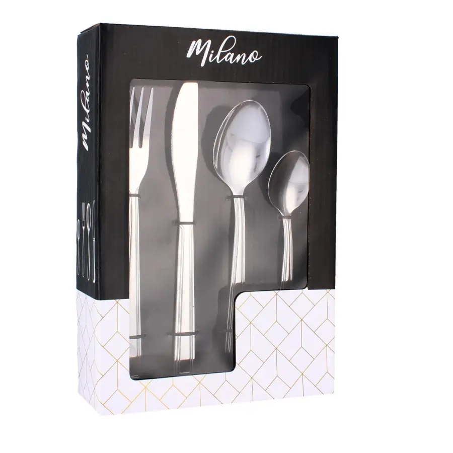 chromniklová nerezová ocel, 24 dílů, obsahuje 6 ks čajových lžiček, 6 ks jídelních lžic, 6 ks jídelních vidliček a 6 ks jídelních nožů, baleno v krabičce.