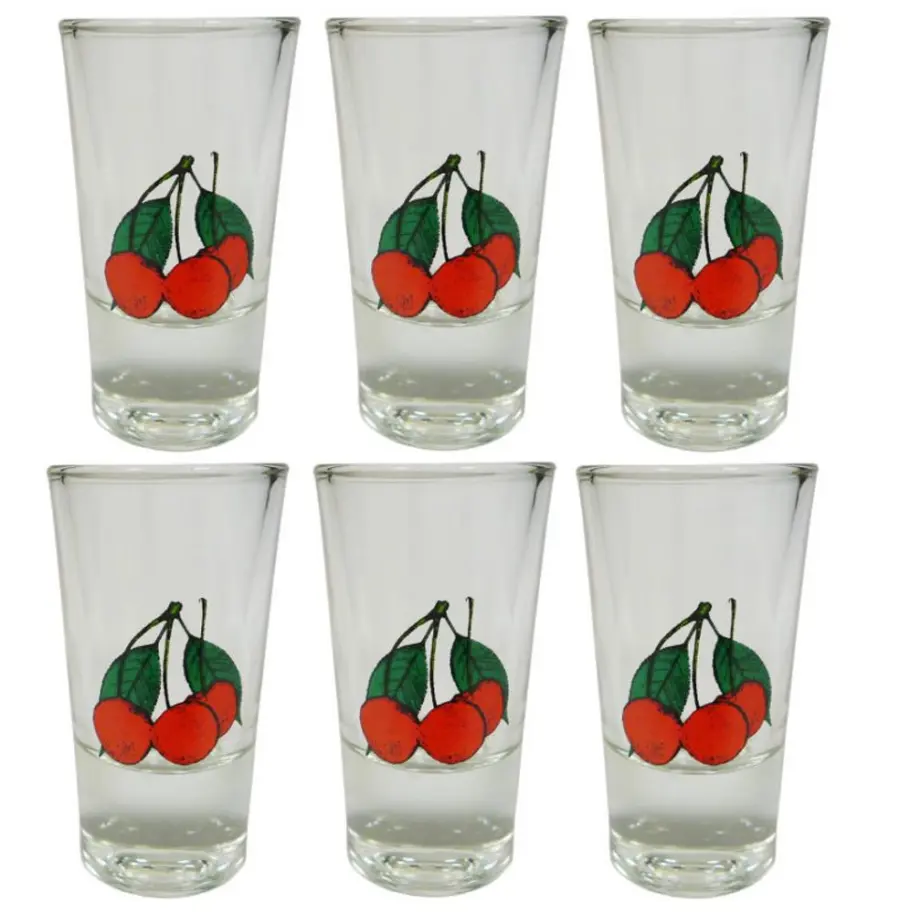 skleněný štamprlík, objem 30 ml, dekor třešeň, sada 6 ks