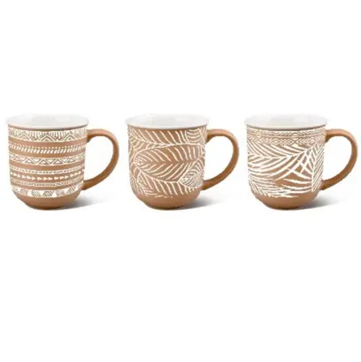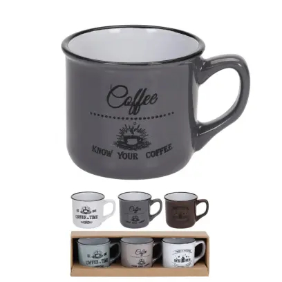 kameninový hrnek 100ml, 85x63x55mm, sada 3 kusů v různých barvách a dekorech, baleno v hnědé "display" krabičce