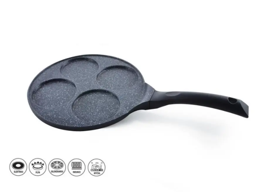 Pánev na volská oka/lívance je masivní odlévaná pánev se sníženým okrajem a s velmi kvalitním nepřilnavým povrchem PFLUON GRANIT. Je určena pro přípravu volského oka, bramborových placek, lívanců atp. s minimální potřebou tuku. Čtyři oka. Na všechny