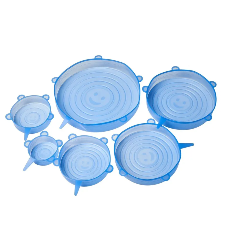 Sada silikonových víček s různými průměry 20/15,5/13,5/11/9/6,5 cm, barva modrá Víčka lze použít na krabice, sklenice, láhve nebo misky, ale také přímo na nakrájené ovoce. Skvěle zabraňuje rychlému vysychání potravin! Technická specifikace: materiál: