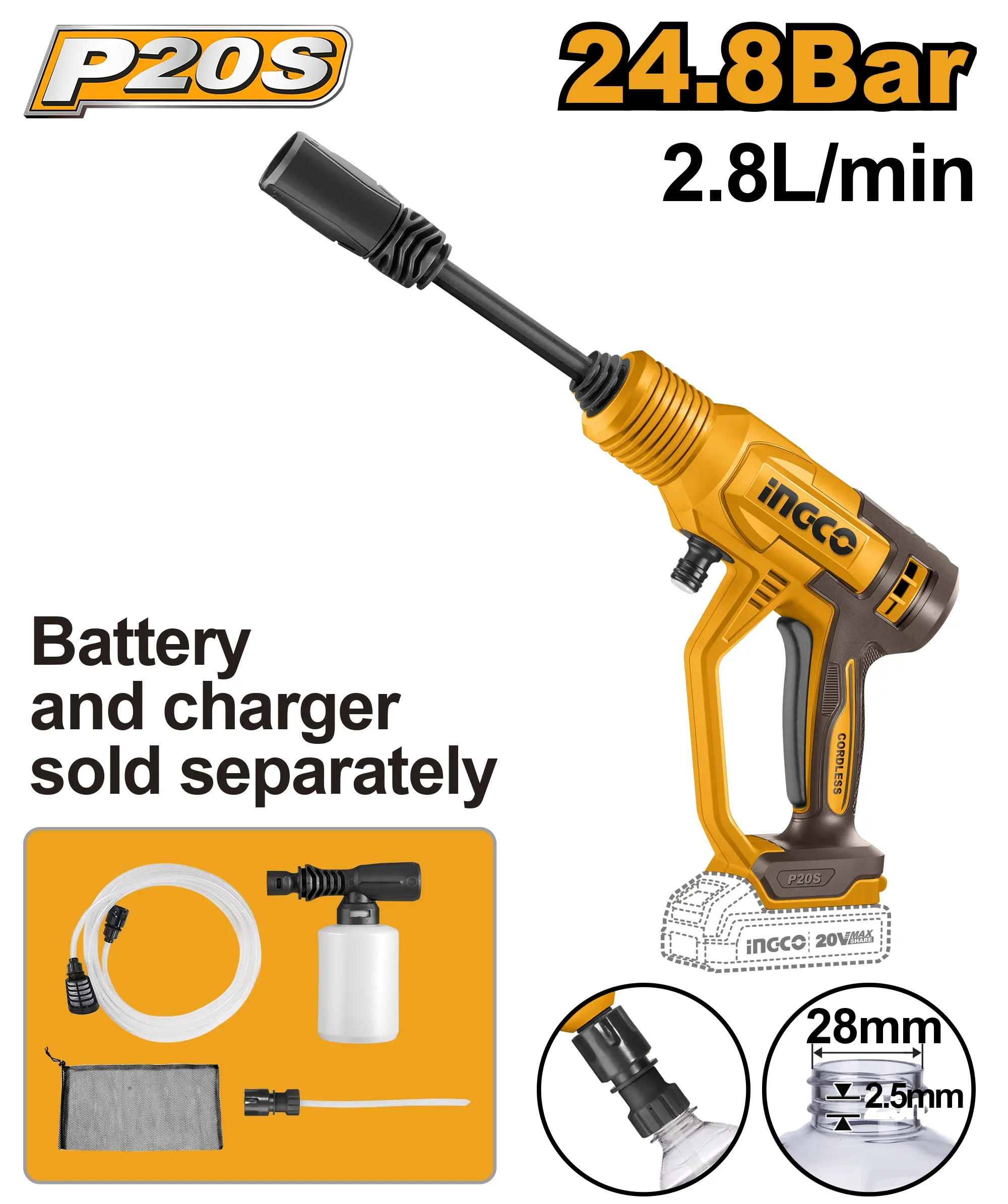 Čistič vysokotlaký AKU, 24.8Bar, 2,8l/min, bez baterie a nabíječky CPWLI2036, Ingco