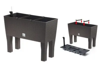 plastový, rozměr 60x24,5 cm, výška na nožičkách 46 cm, imitace ratanu, samozavlažovací, kontrola hladiny, barva hnědá