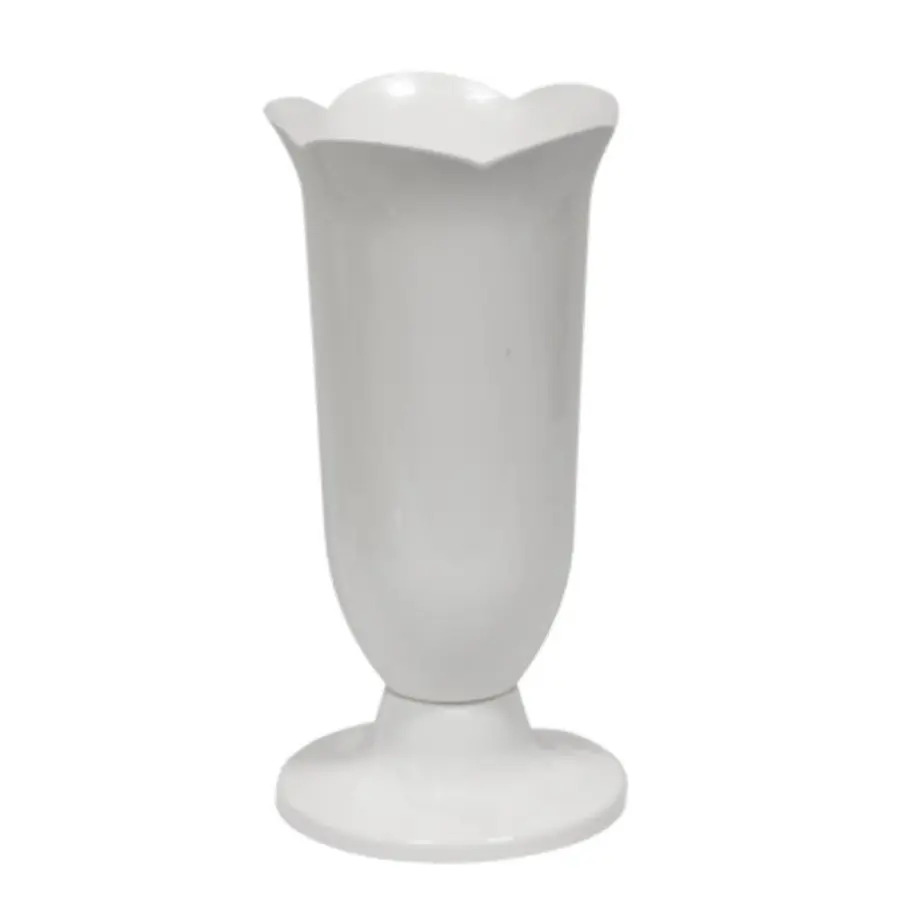 plastová, na kulatém podstavci, výška celé vázy 34,5 cm, v horní části ve tvaru okvětních lístků.