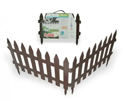 Plastový, 7-dílný, celková délka 3,2 m, výška 27,5 cm, zapichovací, dekorační. Barva plotu je hnědá