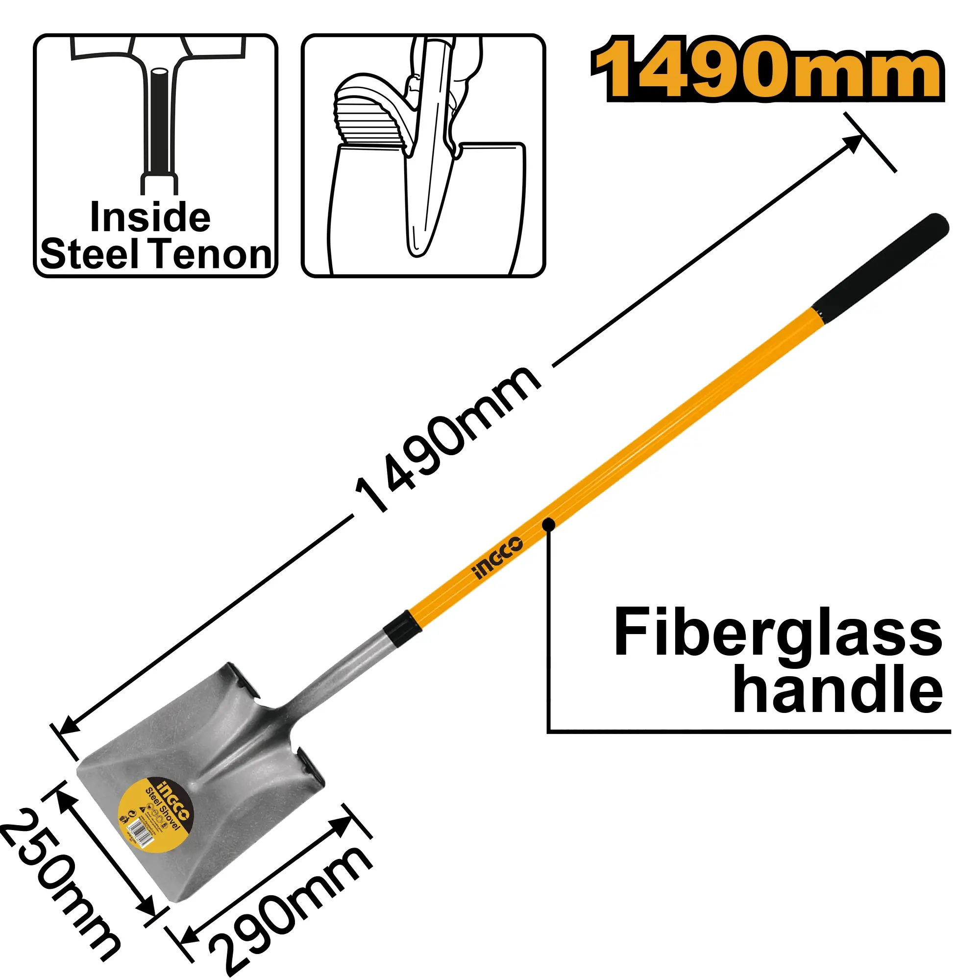Lopata má délku 1490 mm a rozměry čepele 230 × 290.Kombinace ocelové čepele a sklolaminátové rukojeti zaručuje dlouhodobou kvalitu. Ideální pro stavby, zahrady a profesionální manipulaci s volnými materiály.