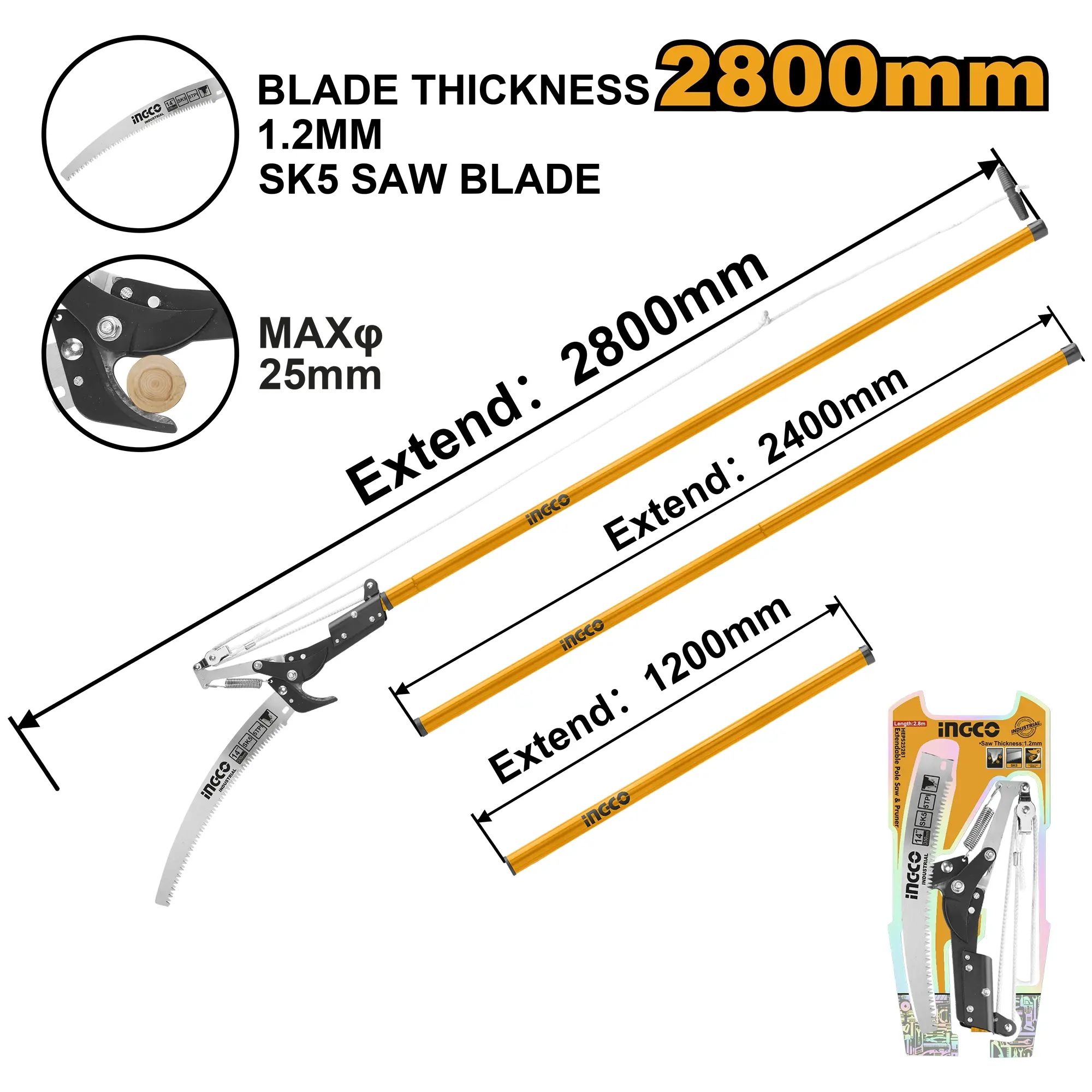 Kombinovaný prořezávač s teleskopickou tyčí umožňuje stříhání vysokých větví bez lešení. Maximální průměr řezu je 25 mm. Ocelová teleskopická tyč se prodlužuje na celkovou délku 2,8 m pro dosah do větších výšek. Čepele jsou vyrobeny z SK5 oceli se speciální tepelnou úpravou. Pila má trojité zuby pro efektivnější řez. Nylonový řetězec 2,7 m s průměrem 1,2 mm spojuje obě strany. Teflonový povrch čepelí snižuje tření.