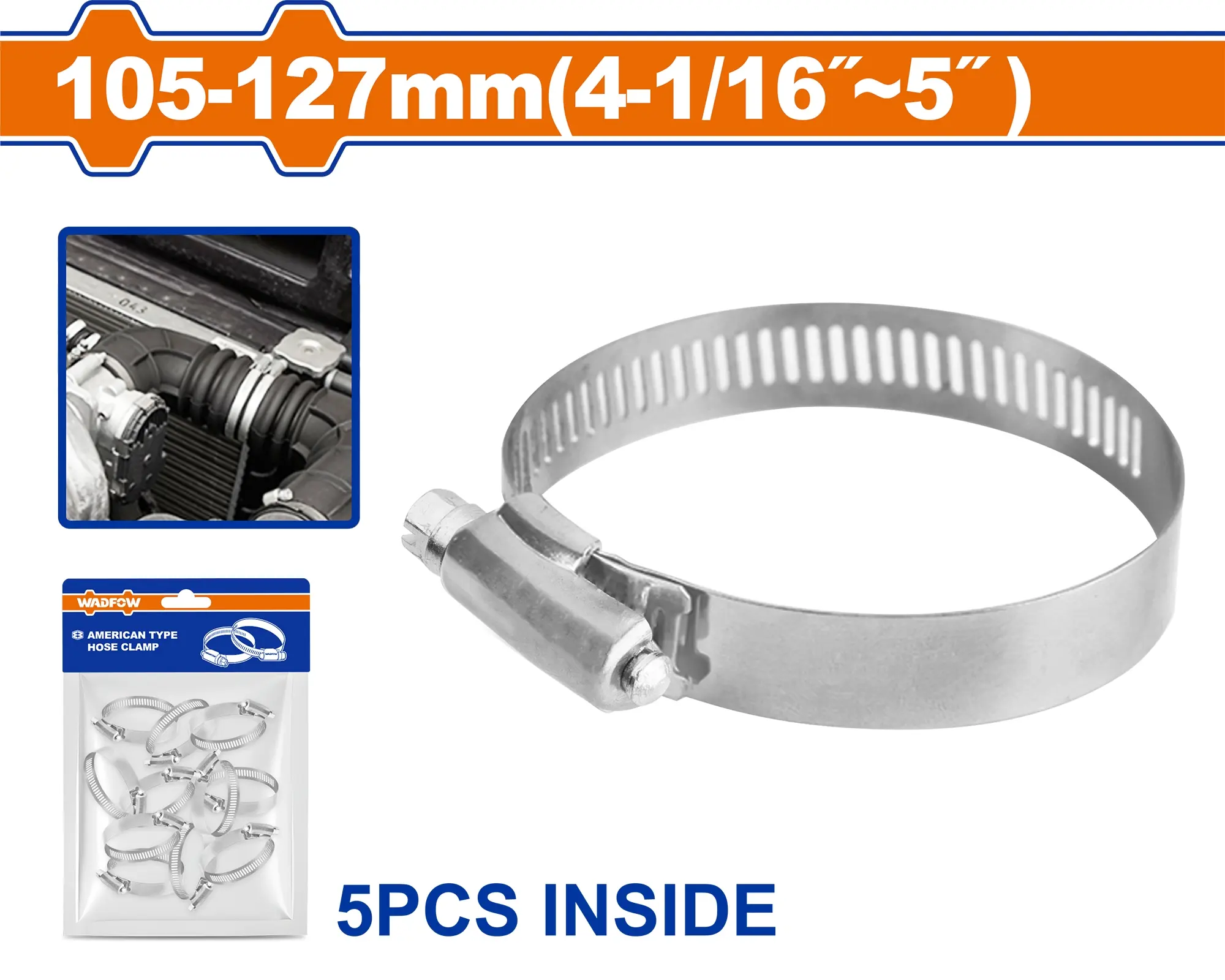 Praktická spona hadicová americká pro upevnění hadic o průměru 105-127 mm (4 1/16"-5"). Páska a pouzdro z nerezové oceli zajišťují odolnost proti korozi, šroub z uhlíkové oceli s pozinkováním. Šestihranný šroub s drážkou umožnuje jednoduchou montáž.