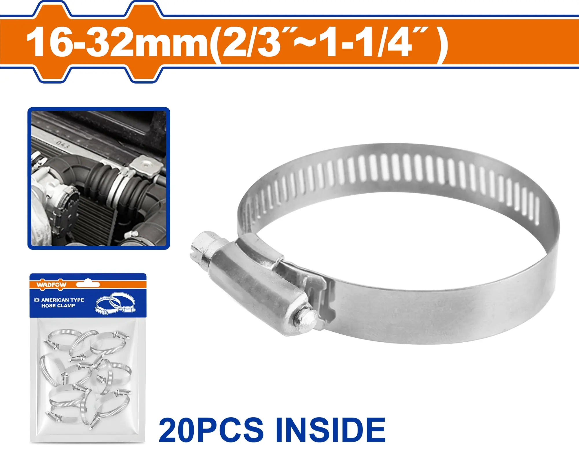 Praktická spona hadicová americká pro upevnění hadic o průměru 16-32 mm (2/3"-5/4"). Páska a pouzdro z nerezové oceli zajišťují odolnost proti korozi, šroub z uhlíkové oceli s pozinkováním. Šestihranný šroub s drážkou umožnuje jednoduchou montáž.