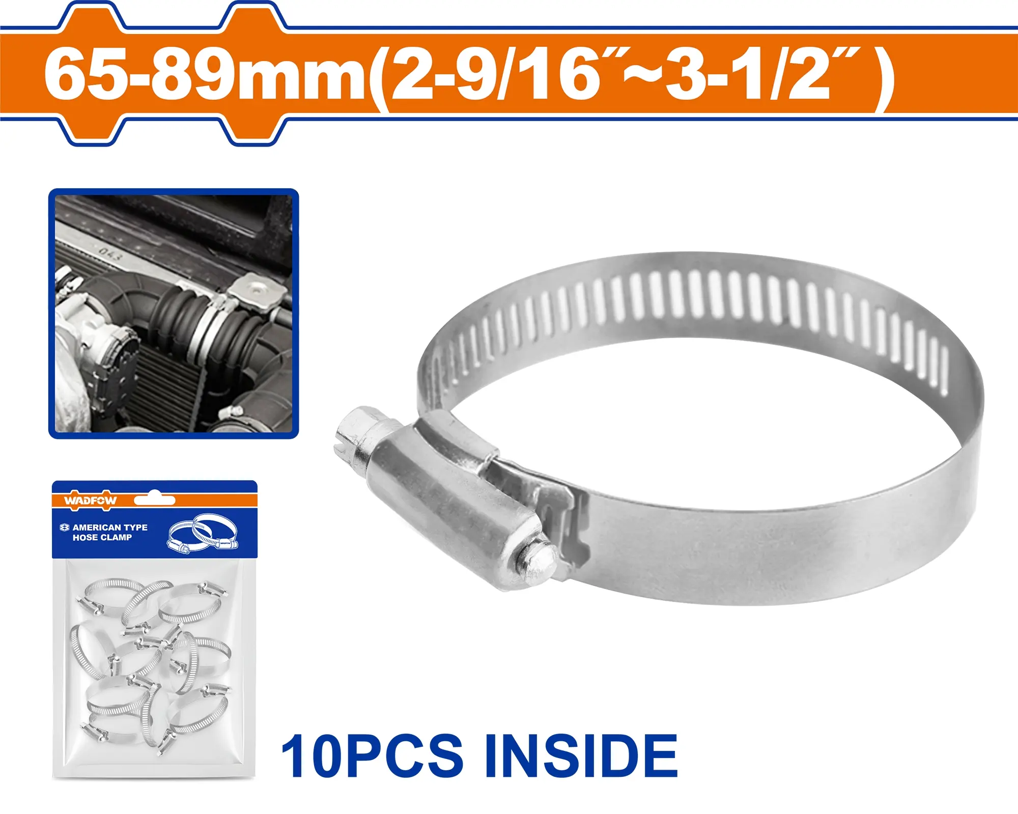 Praktická spona hadicová americká pro upevnění hadic o průměru 65-89 mm (2 9/16"-3 1/2"). Páska a pouzdro z nerezové oceli zajišťují odolnost proti korozi, šroub z uhlíkové oceli s pozinkováním. Šestihranný šroub s drážkou umožnuje jednoduchou montáž.
