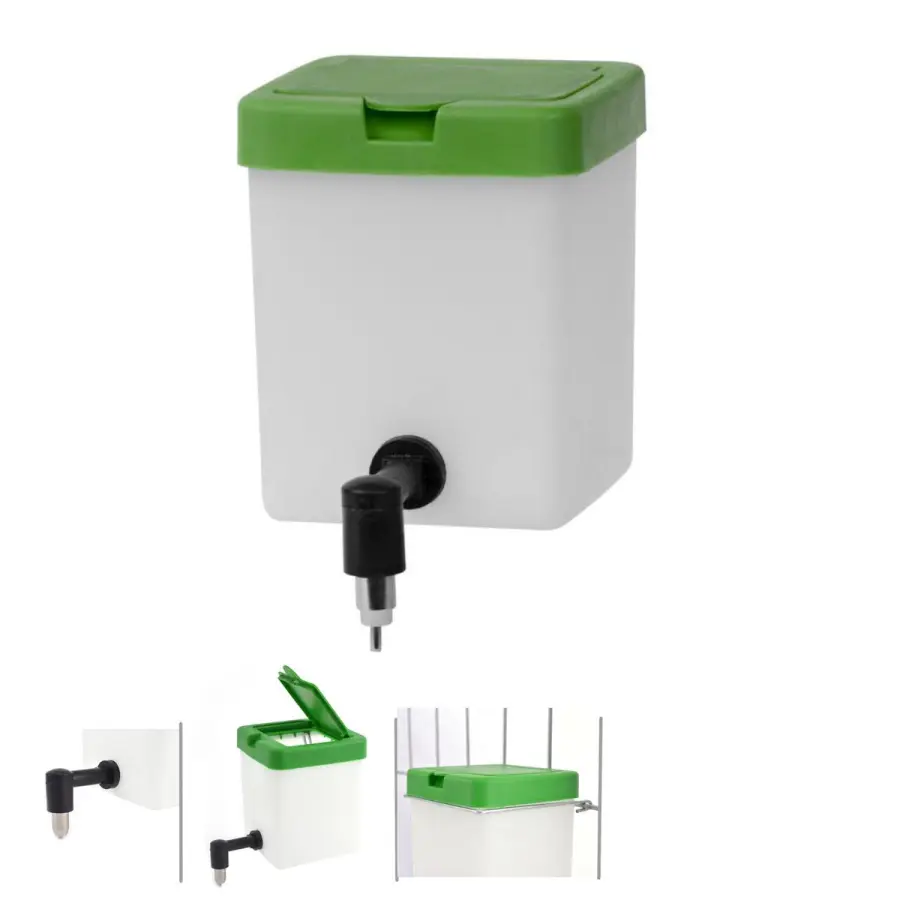 Niplová, obdélníková napáječka pro králíky o objemu 0,5l. Má jednoduchý způsob dolévání, je lehce omyvatelná, s možností zavěšení. Kovový držák na zavěšení je součástí balení