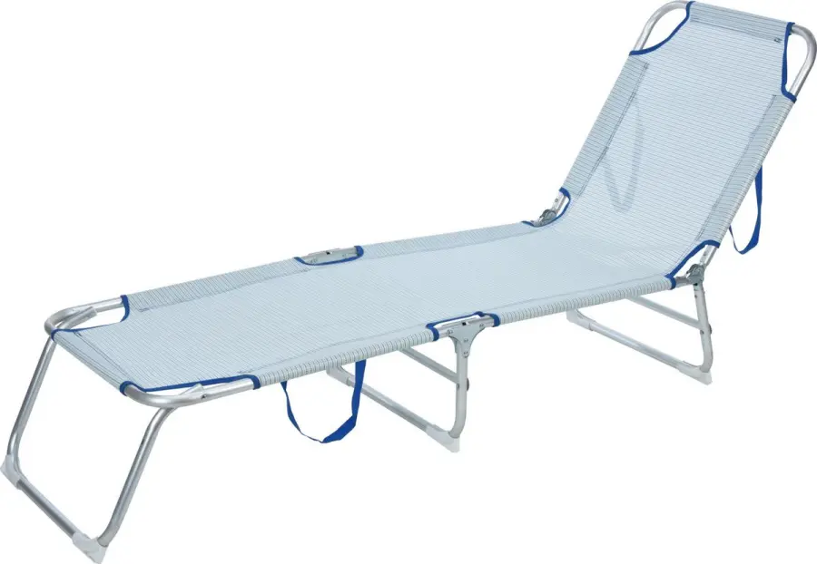 lehátko, hliníkový rám s polyesterovou tkaninou 2x1, světle modrá barva, rozměry 187x53x27cm, ALU trubka 22x1,2mm, vnitřní průměr ocelové trubky 19x0,6mm, s PP zakončením rohů, všechny plastové díly v bílé barvě, rozměry lehátka výška 28cm (uprostřed