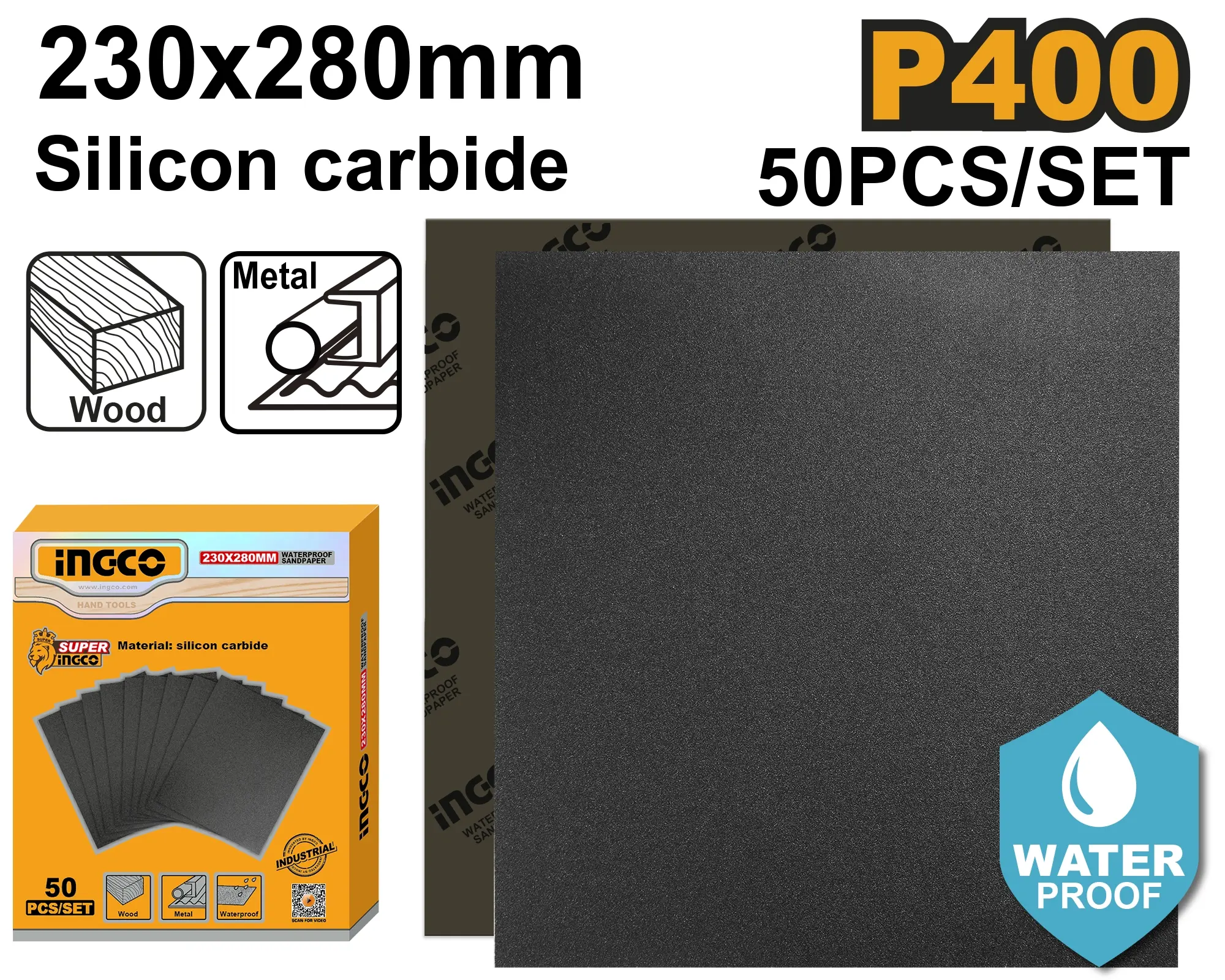 Sada 50 kusů brusných papírů o rozměru 230 × 280 mm se zrnitostí P400 je ideální pro jemné broušení a dokončovací práce. Vyrobeny z karbidu křemíku, tyto voděodolné papíry jsou kompatibilní s většinou ručních brusných bloků a zajišťují efektivní a rovnoměrný brus na různých površích.